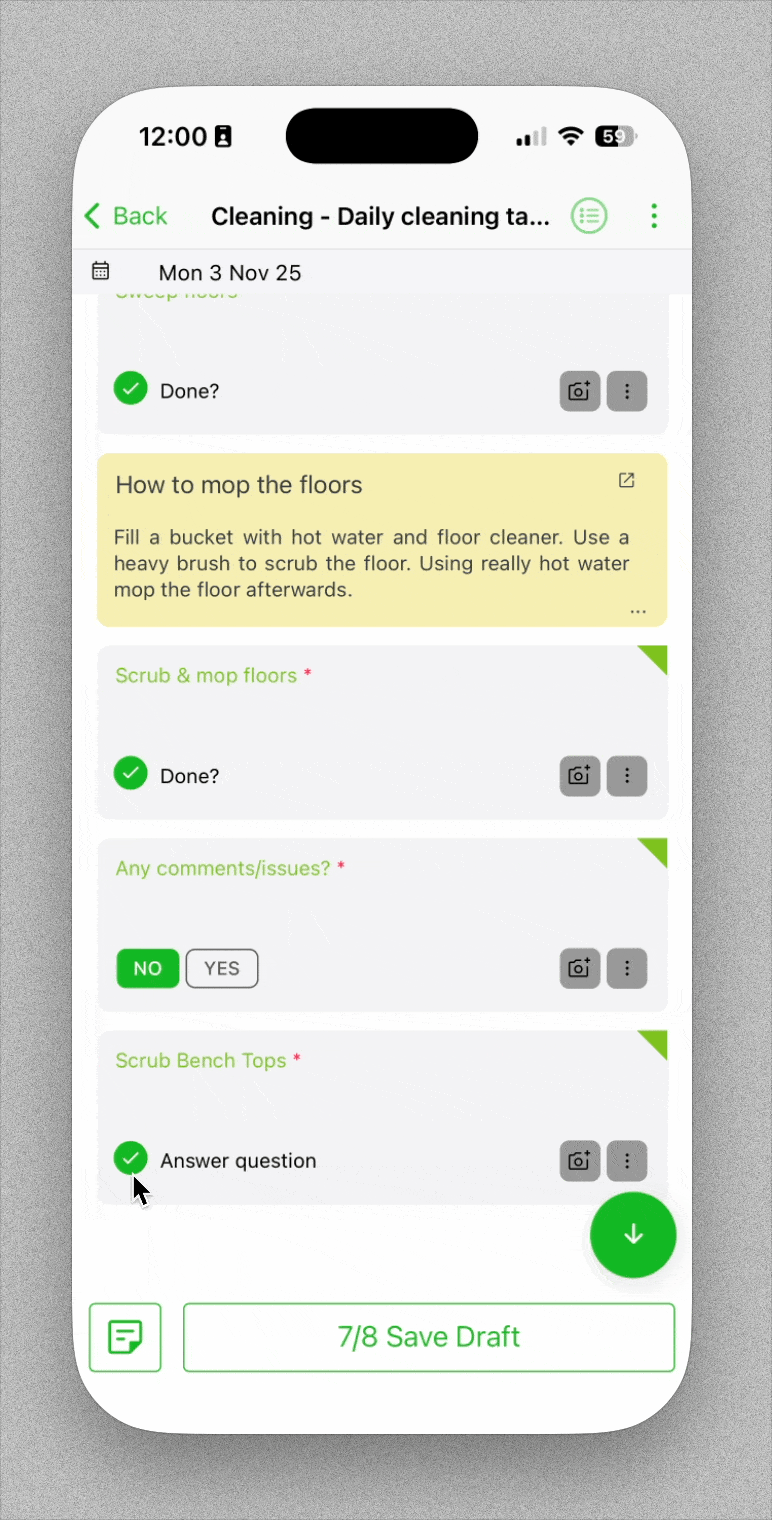 Now, the tablet can be left in the kitchen. When a staff member needs to complete a temperature check, they simply pick up the tablet, open the form, and select their own name from the "staff" dropdown within the form.