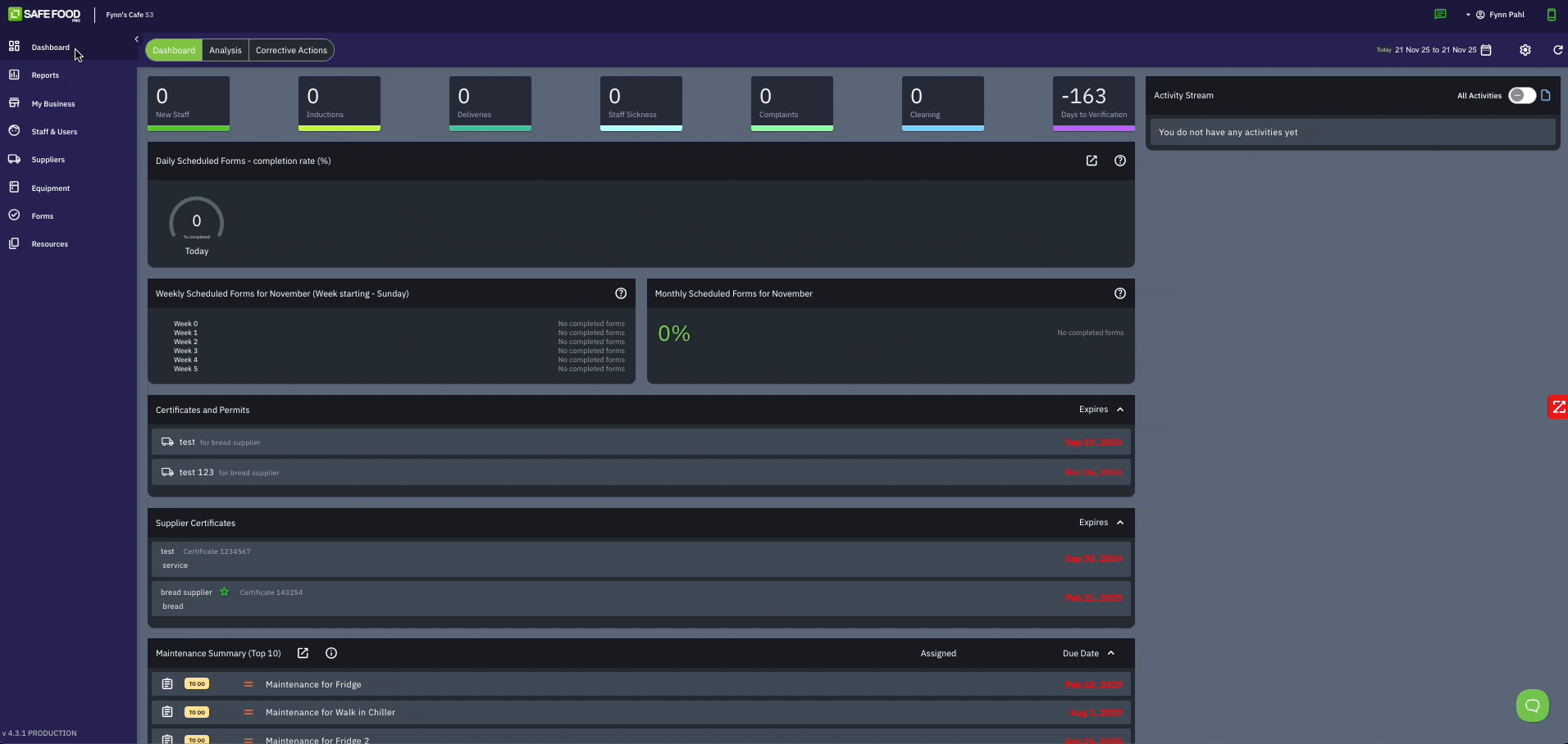 Use the Safe Food Pro Dashboard to monitor progress in your business and to check for any issues or tasks that need to be completed
