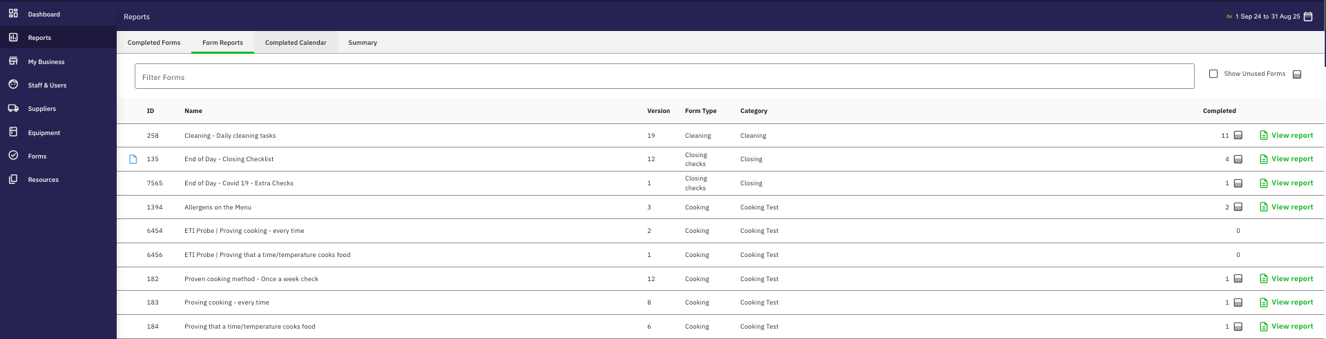 The 'Form Reports' page allows you to generate reports for any form you have completed in Safe Food Pro.
