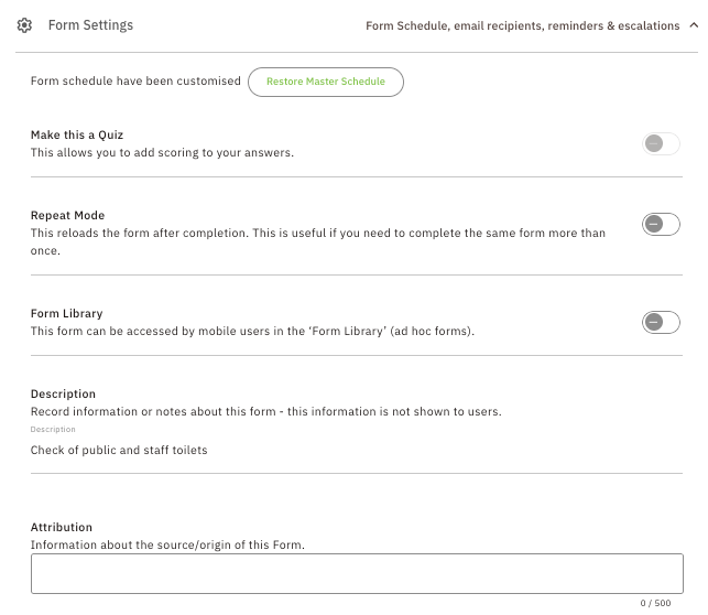 - Show what your form is based on or its original source e.g. if it is based on a food safety form you can link the original form as an Attribute.
