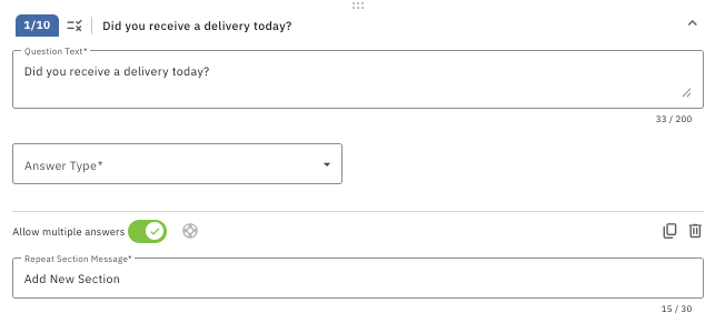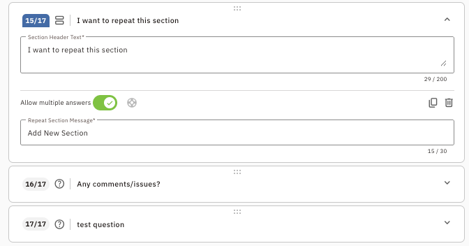 Section Header - The Section Header enables you to segment your Form. You can also set up Repeating Sections. That means you can repeat all the questions in a Section set.