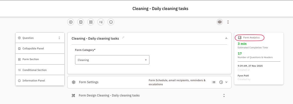 Form Analytics provides a summary of form details, including the estimated completion time, number of questions, creation & modification date, and creator & modifier information.