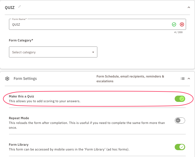 - When you start a new form ensure you tick the box "This form is to used as a quiz"