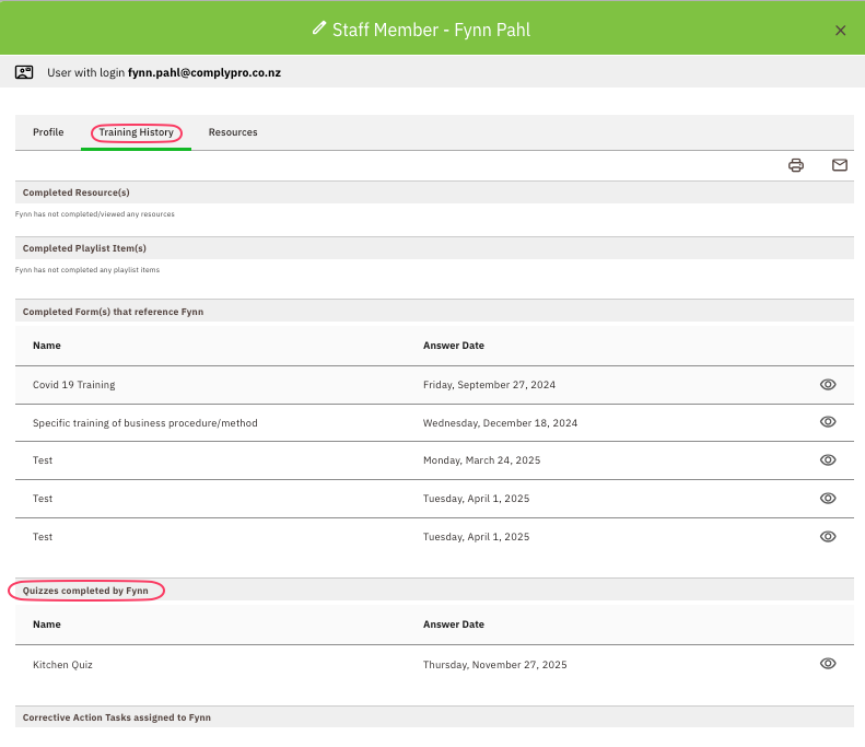 You can also view the Quiz straight from the Staff Profile: