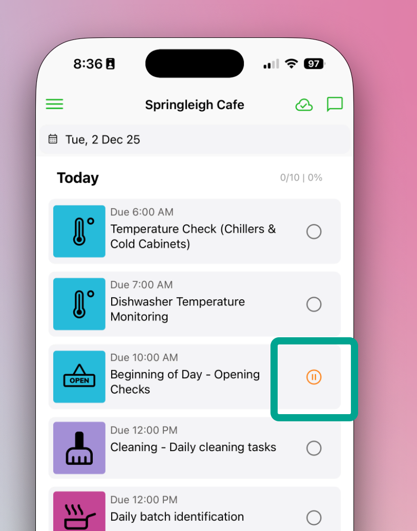 You can partially complete a form in the mobile application and then open it again later to complete the form. For example, you may be interrupted when filling in a form, or you are filling in a calibration or proving cooking form where you have to wait for some time between measurements.