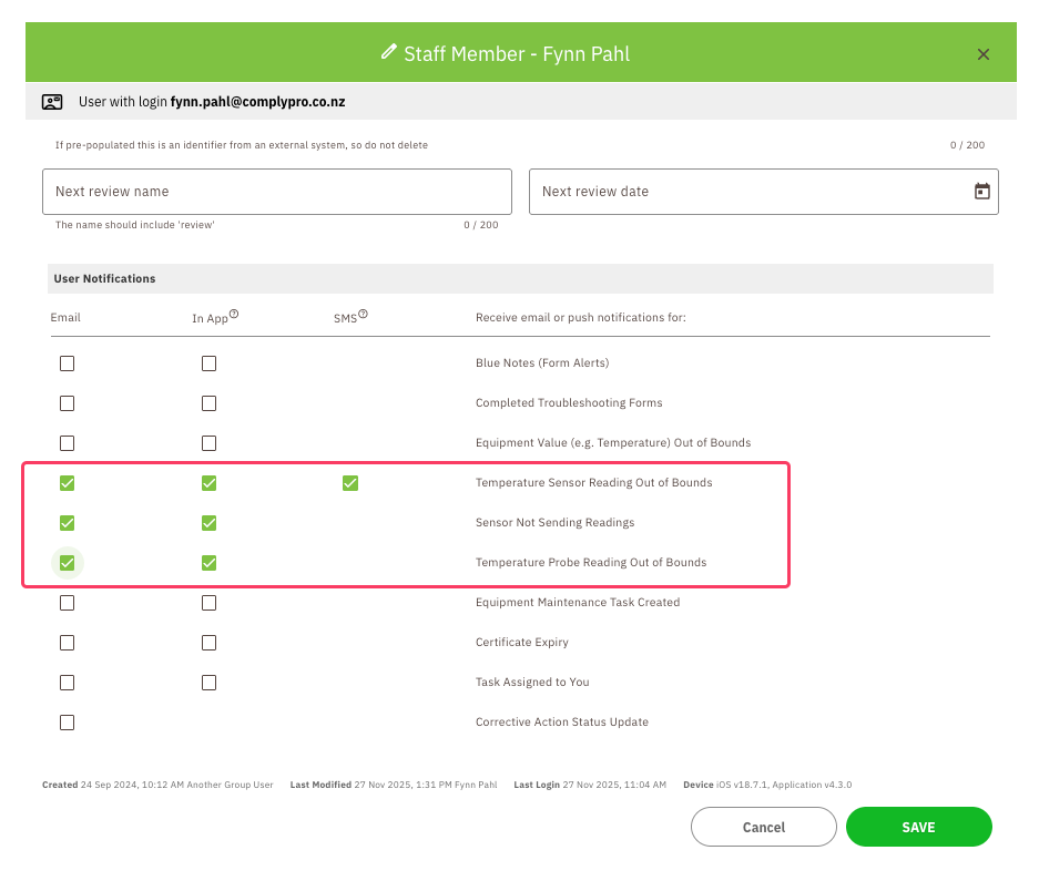 - Check the relevant boxes for the user depending on what type of notifications they need to receive.