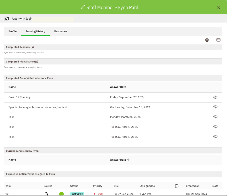 Get an individual report of all of the Resources, Training forms, Quiz's & Follow-Up Actions completed by an individual staff member straight from their profile. To view this: