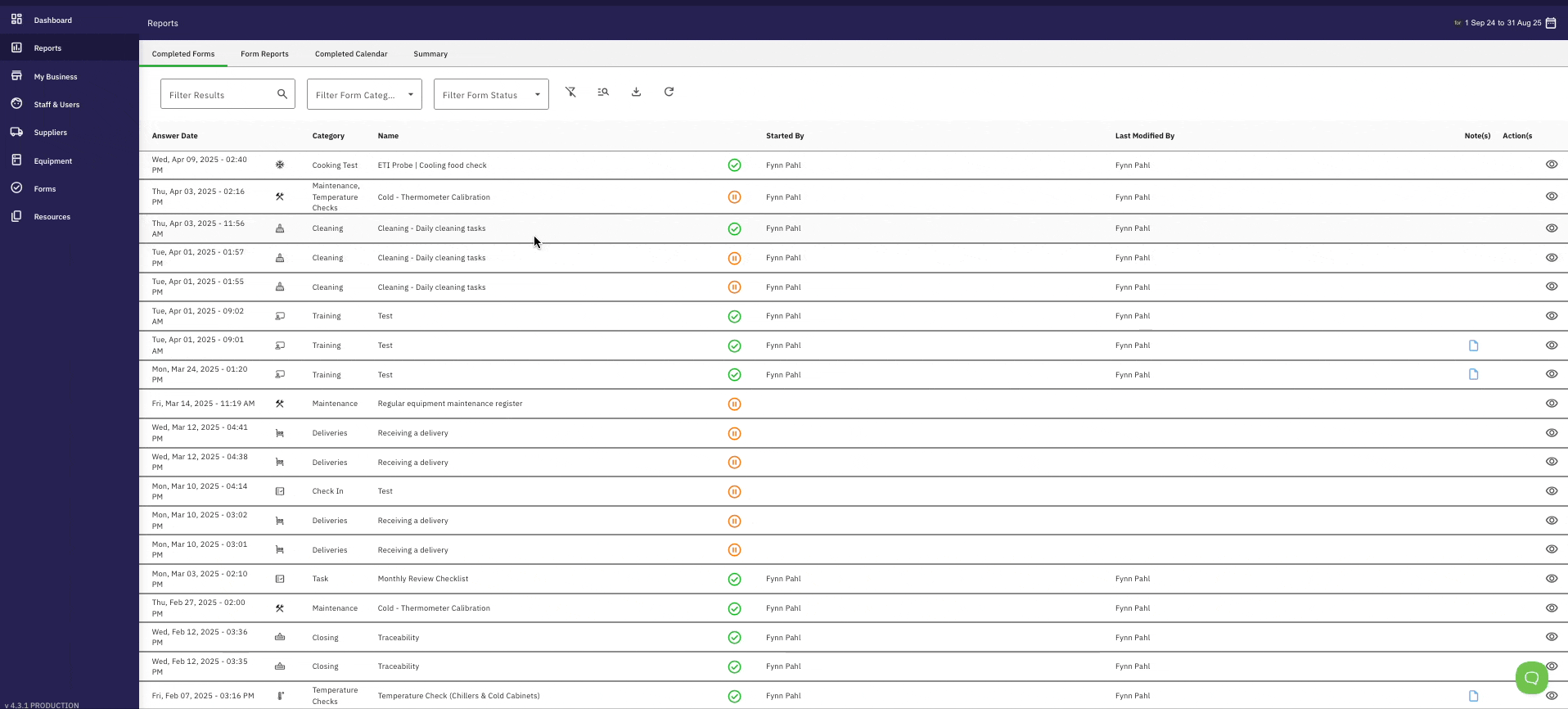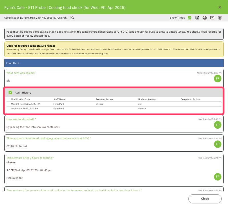 You may want to keep track of changes your staff have made to your forms. For example, this can be helpful to update temperature check forms when your Fridge has an out-of-bounds temperature. With the Audit History turned on you'd be able to: