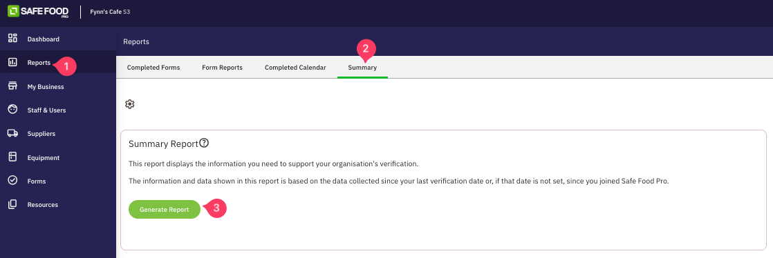 - Summary Report, which gives you a collation of your Food Safety Records that you can send to your auditor.
