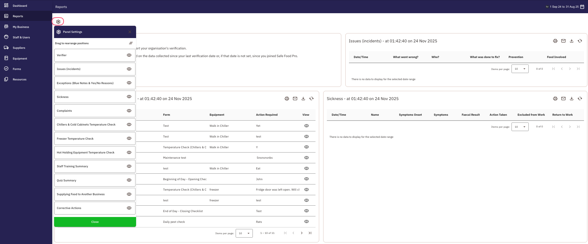 - Smaller Summary report snippets throughout the page, these are summary snippets that give you an insight into Incidents, Training, Exceptions, Temperature Checks & more.